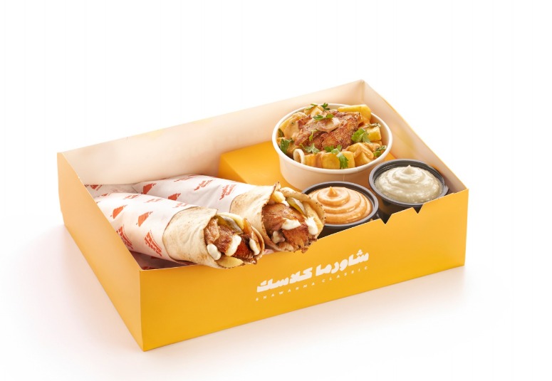 بوكس يحتوي على 2 شاورما كلاسك مع بطاطا حارة، صوص ثوم، صوص ثوم حار.