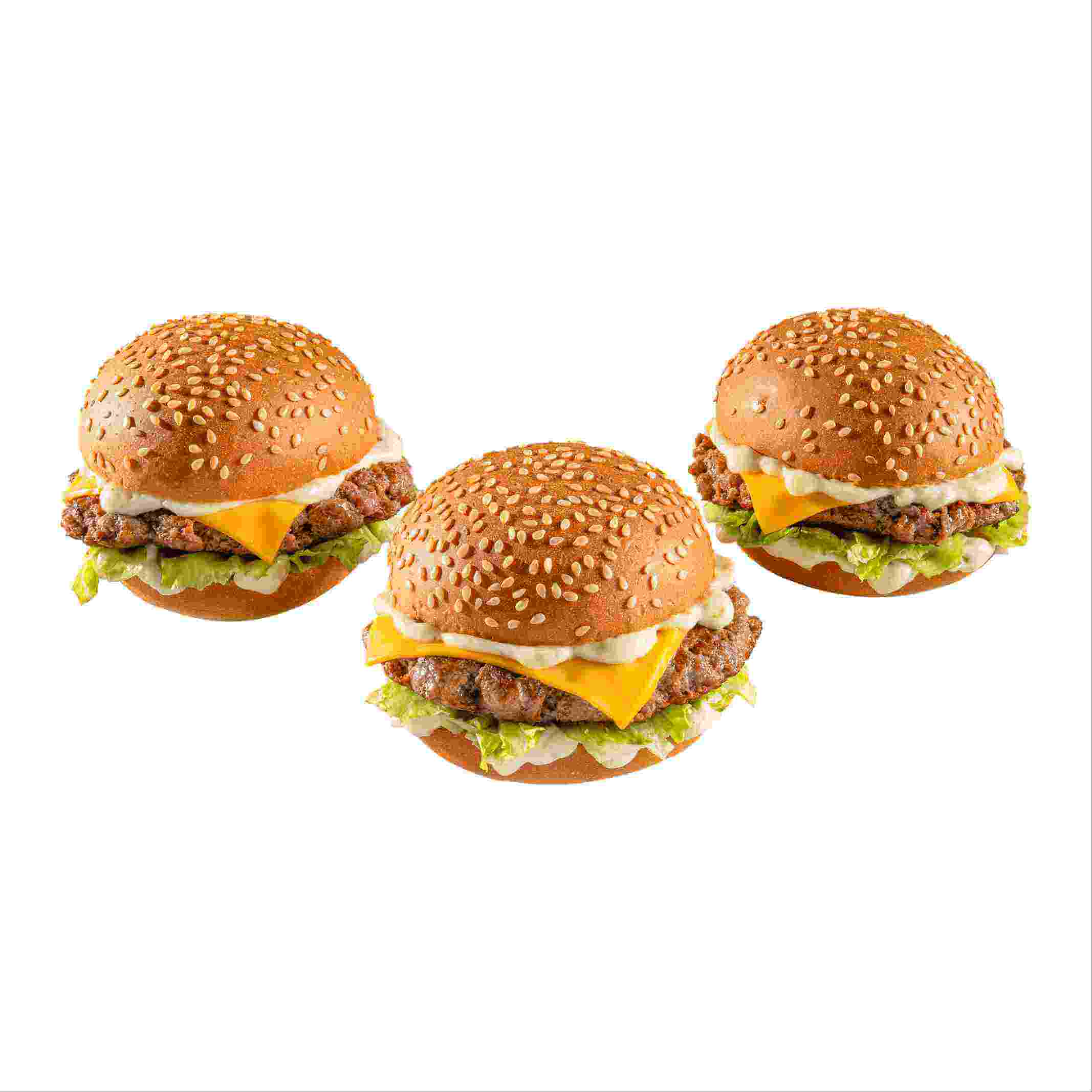 ثلاث قطع من البرجر شريحة من اللحم الطازج وشريحة من جبن الشيدر الذايب وصوص كلاسك الخاص (تحضر عند الطلب)